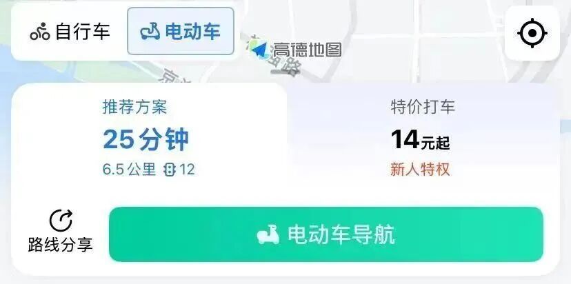 骑行电动车出行前,务必将导航软件切换至“骑行-电动车”时势,该时势会自动遮掩高速公路、城市快速路、高架正直等非无邪车禁行路段,讨论安全道路。