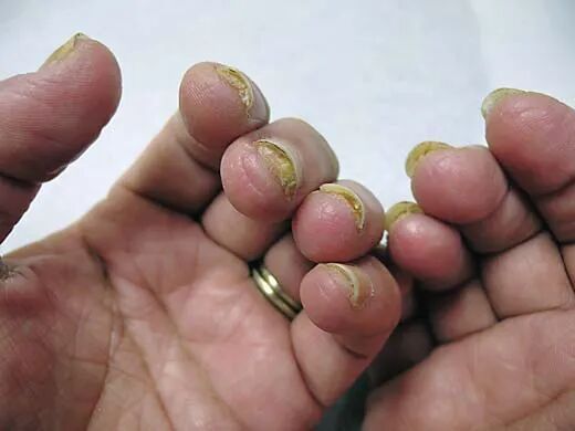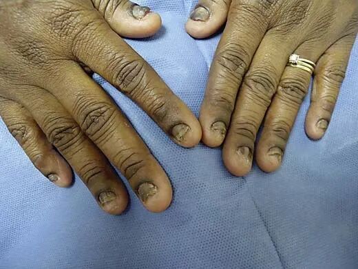 一位51岁的患者,在恒久作念光固好意思甲后,指甲出现甲分离、甲下角化过度、甲沟近端色素千里着以及指船面缺失的症状 | 参考贵寓[1]