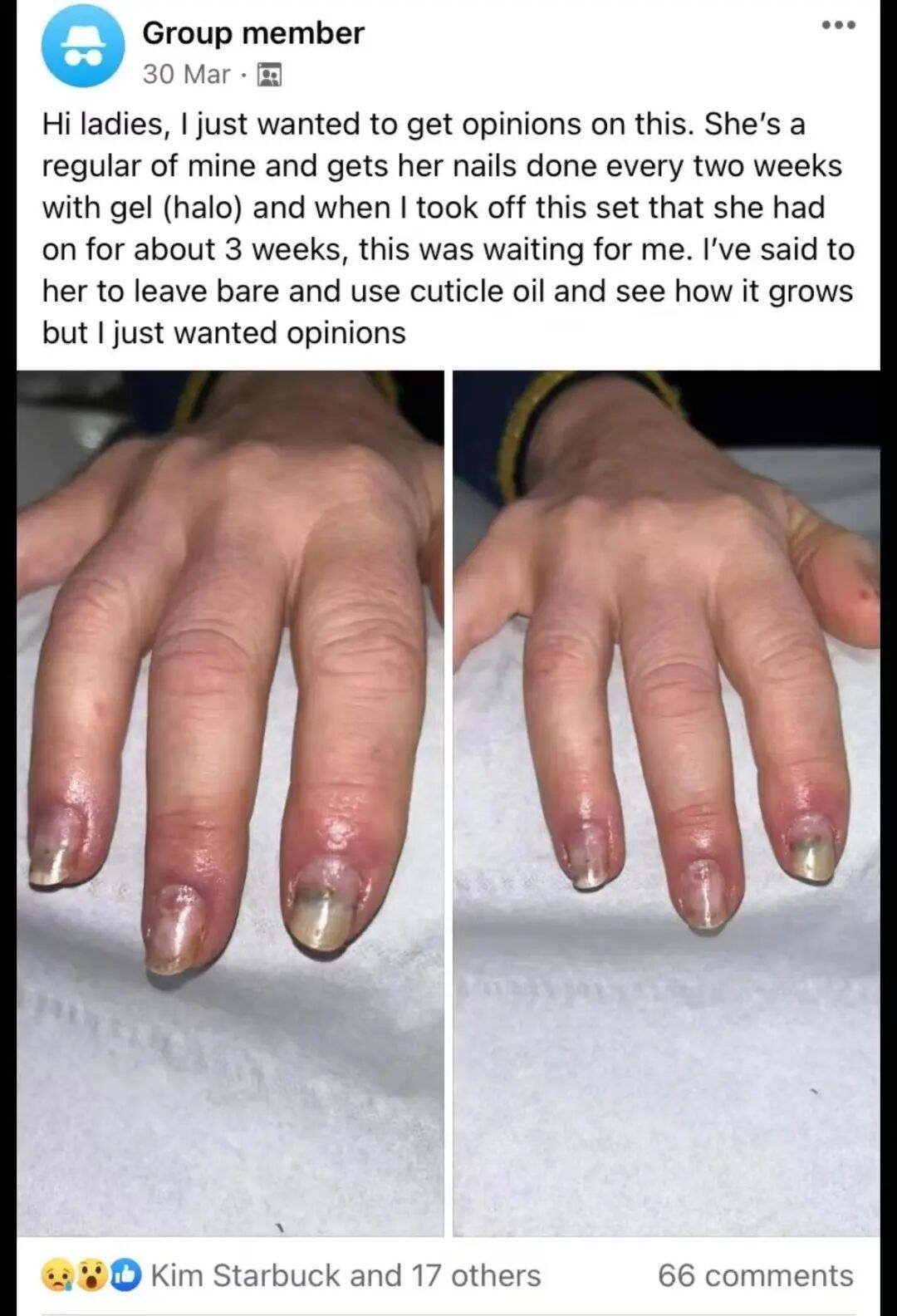 “这是我的一位常客,每两周会作念一次用甲油胶的好意思甲,当我计帐掉前次的好意思甲,看到她的手仍是变成了这样。”|Nail Tech Awareness